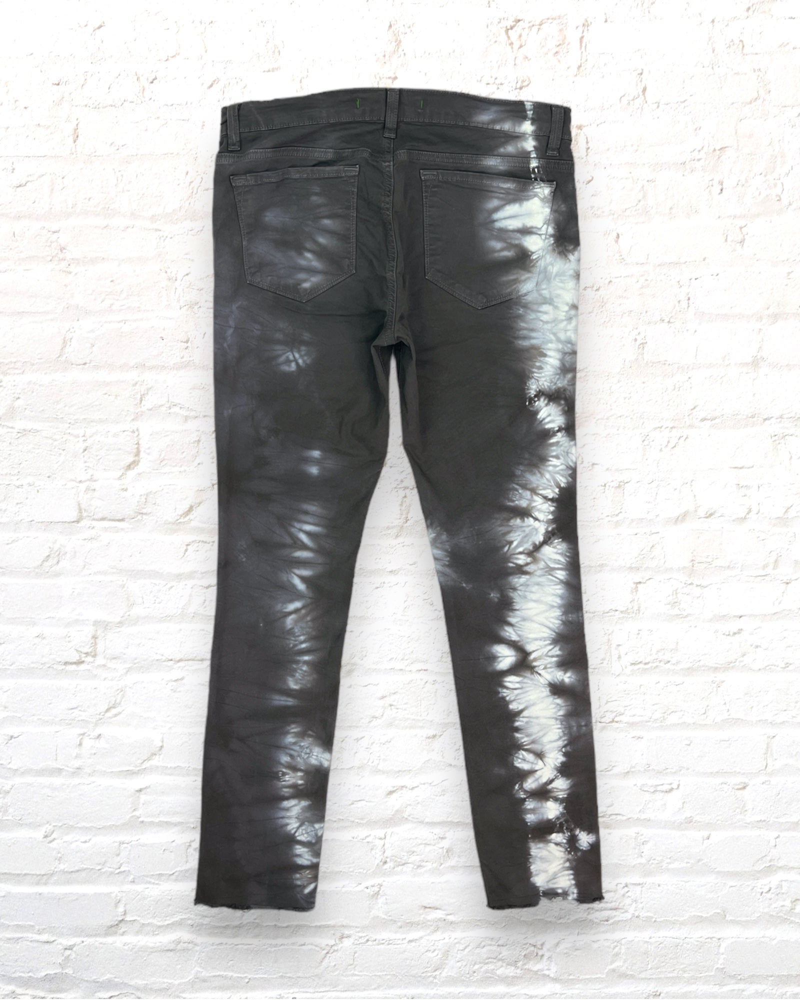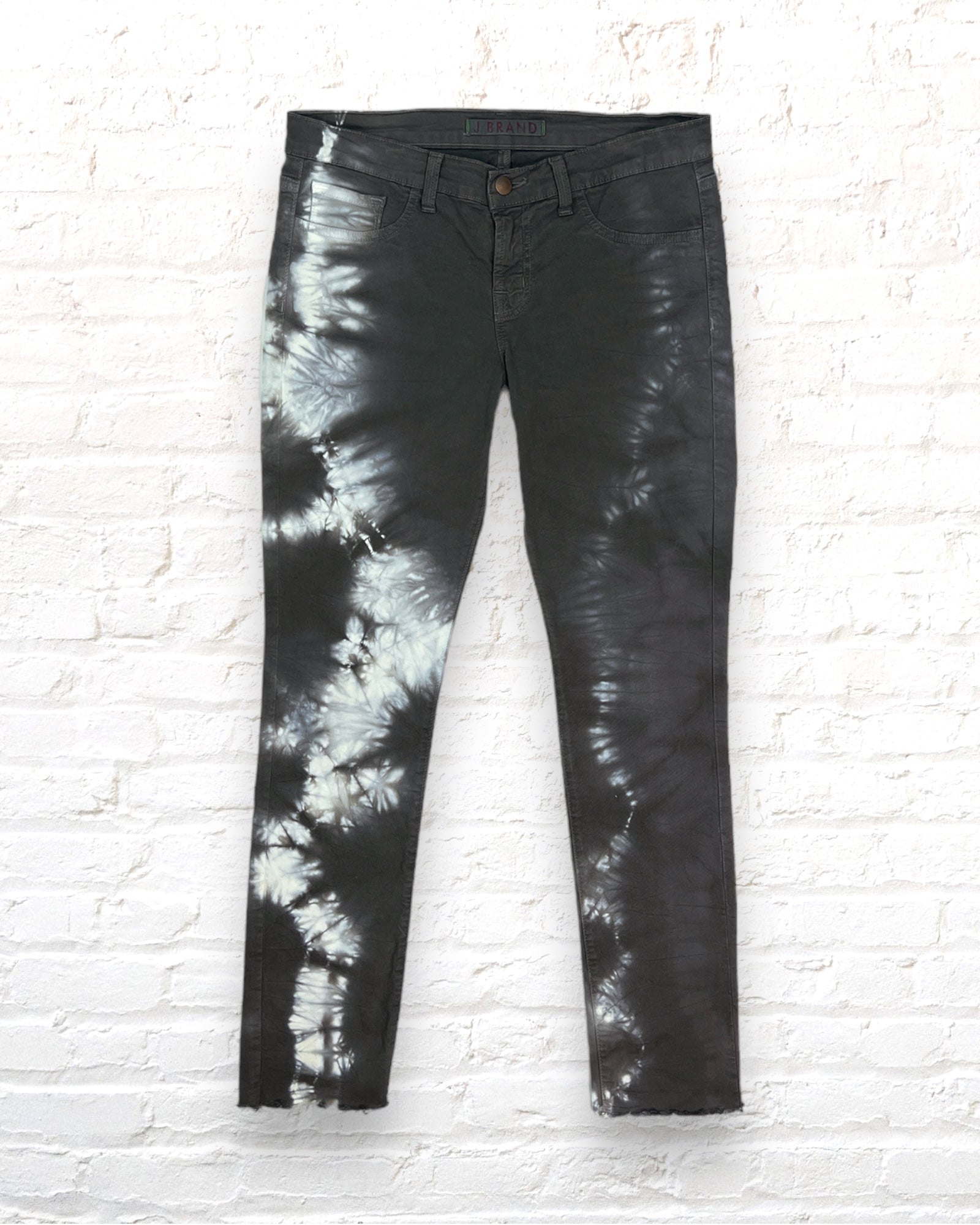 These J Brand twill pants are in a cigarette cut and have a tye dye appearance with raw hems.