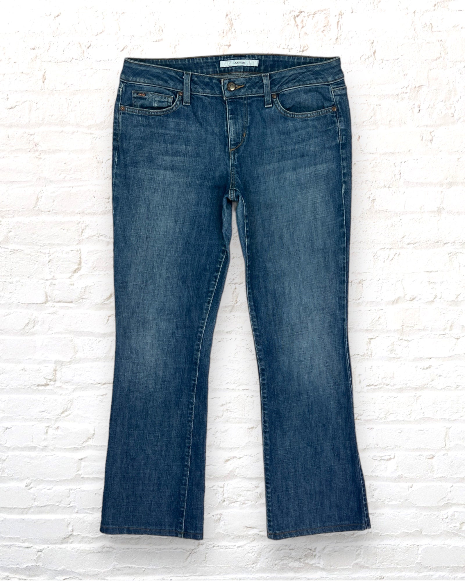 Joe's Jeans with whiskering on front pockets, fading on thighs to knees, and fading on seat. Light distressing on pockets. Leather logo on right back pocket.