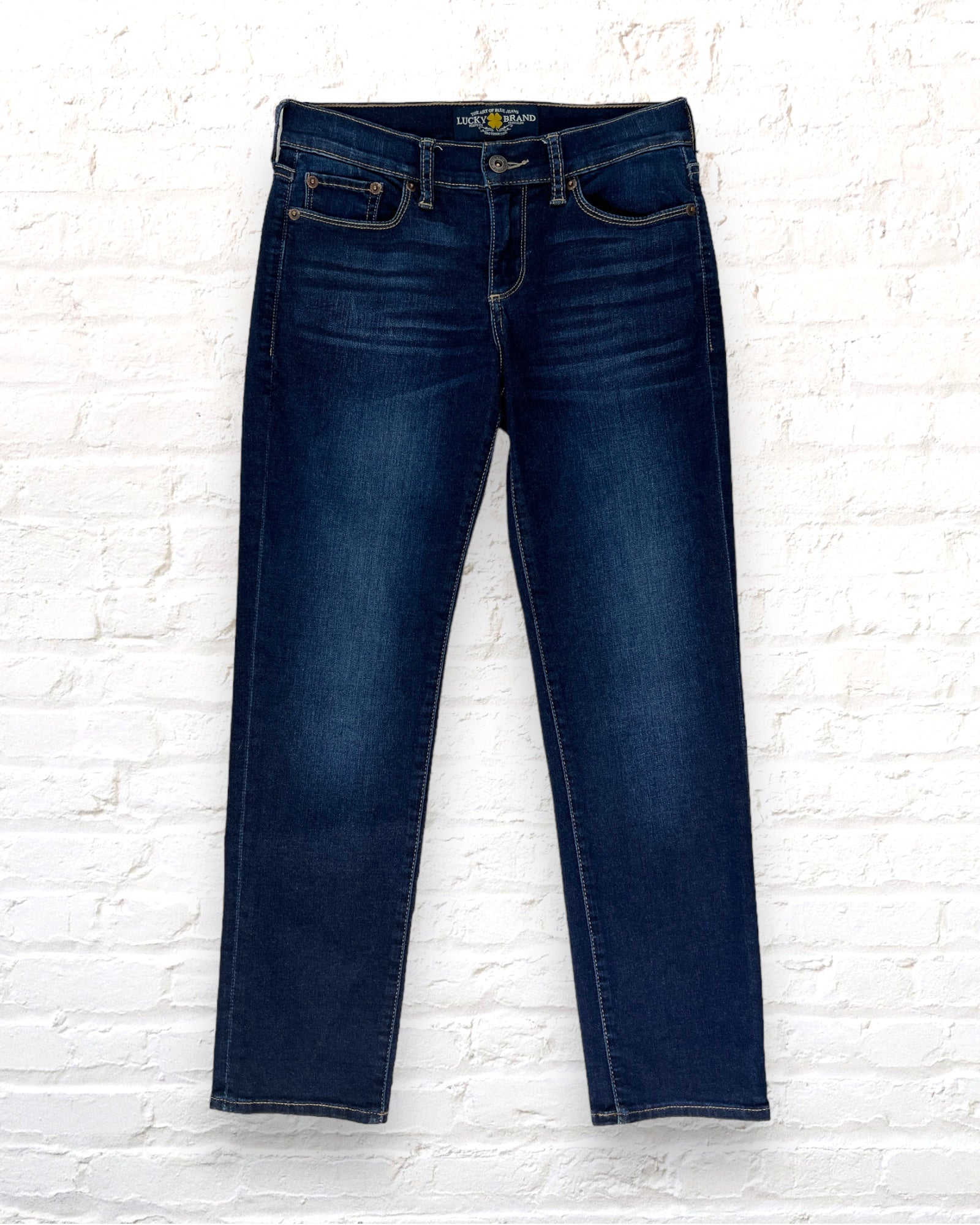 Lucky Brand jeans in a dark wash with lots of stretch. Light whiskering and fading on the front.
