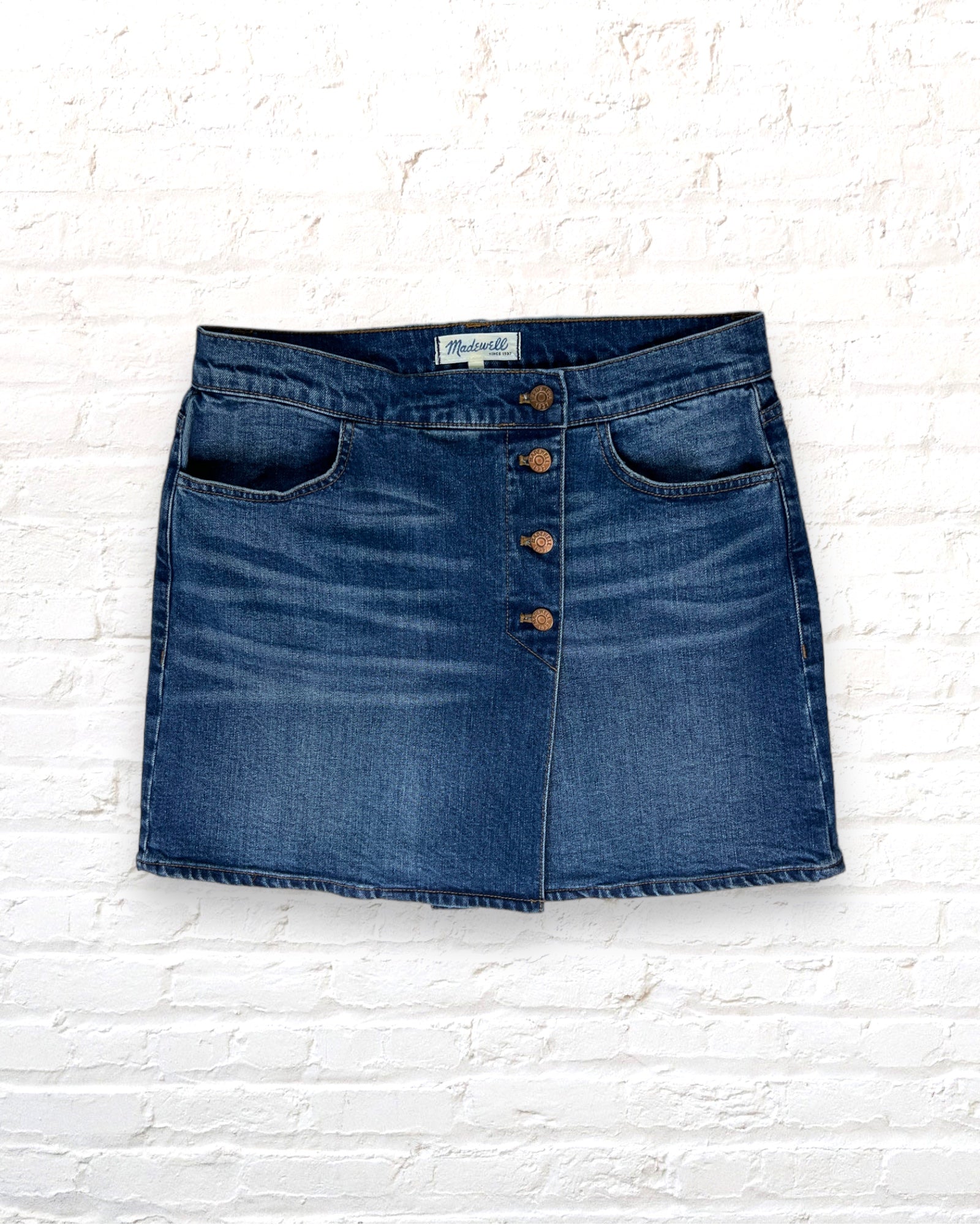 This Madewell skirt has buttons down the front as well as whiskering and fading. Light fading on the back.