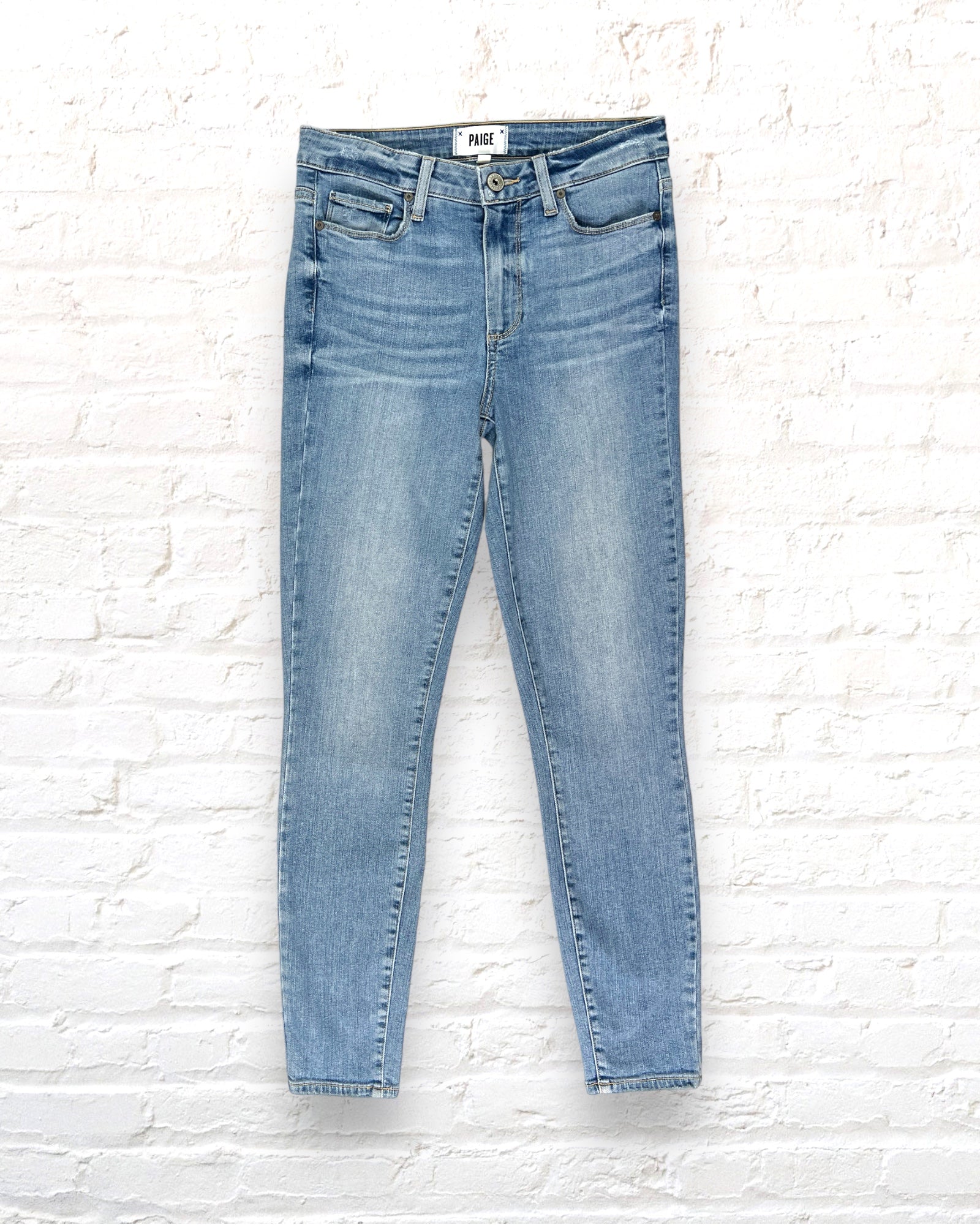 Paige jeans in a light wash with whiskering on pockets and fading from thigh to knees. Light distressing on pockets and waistband.