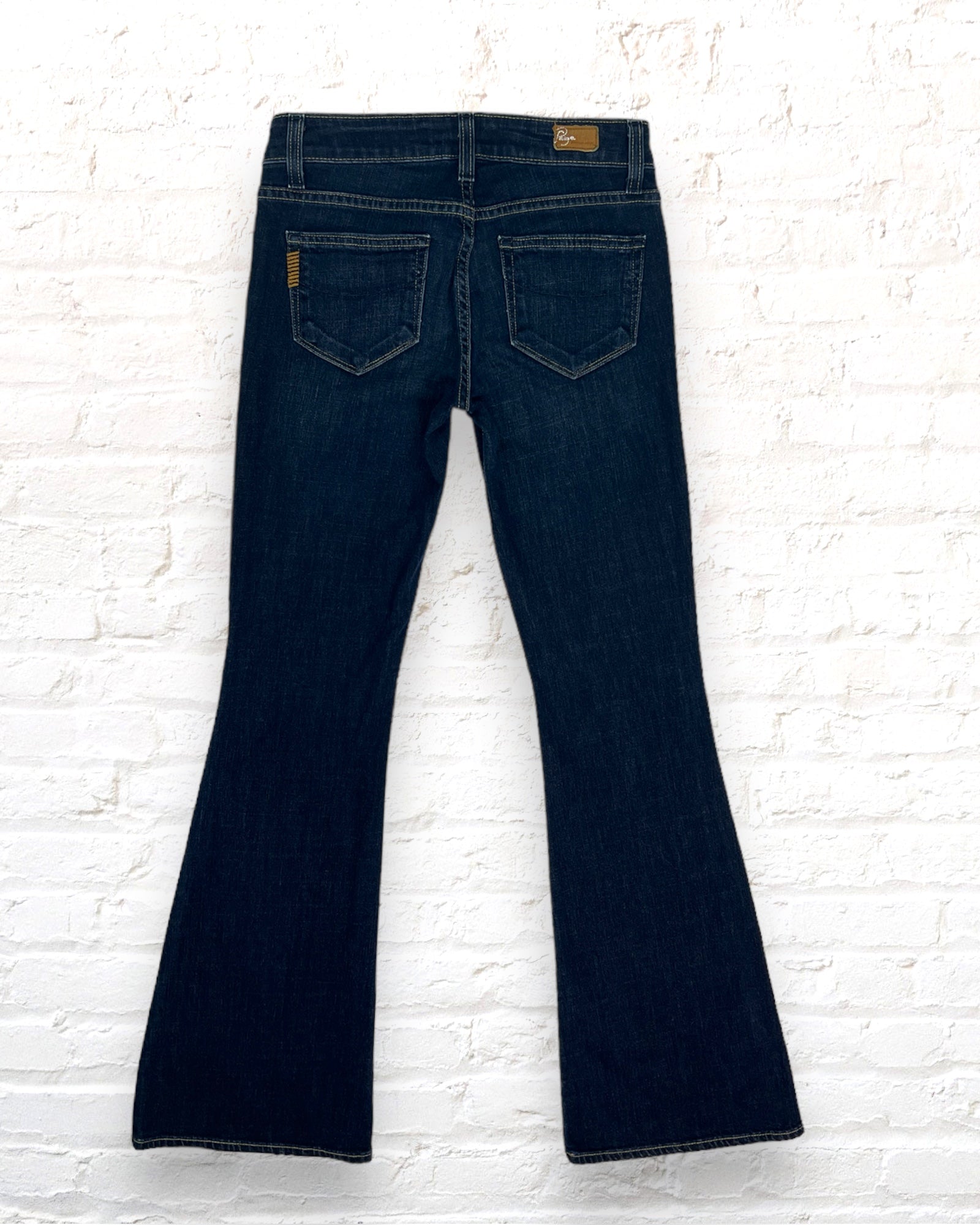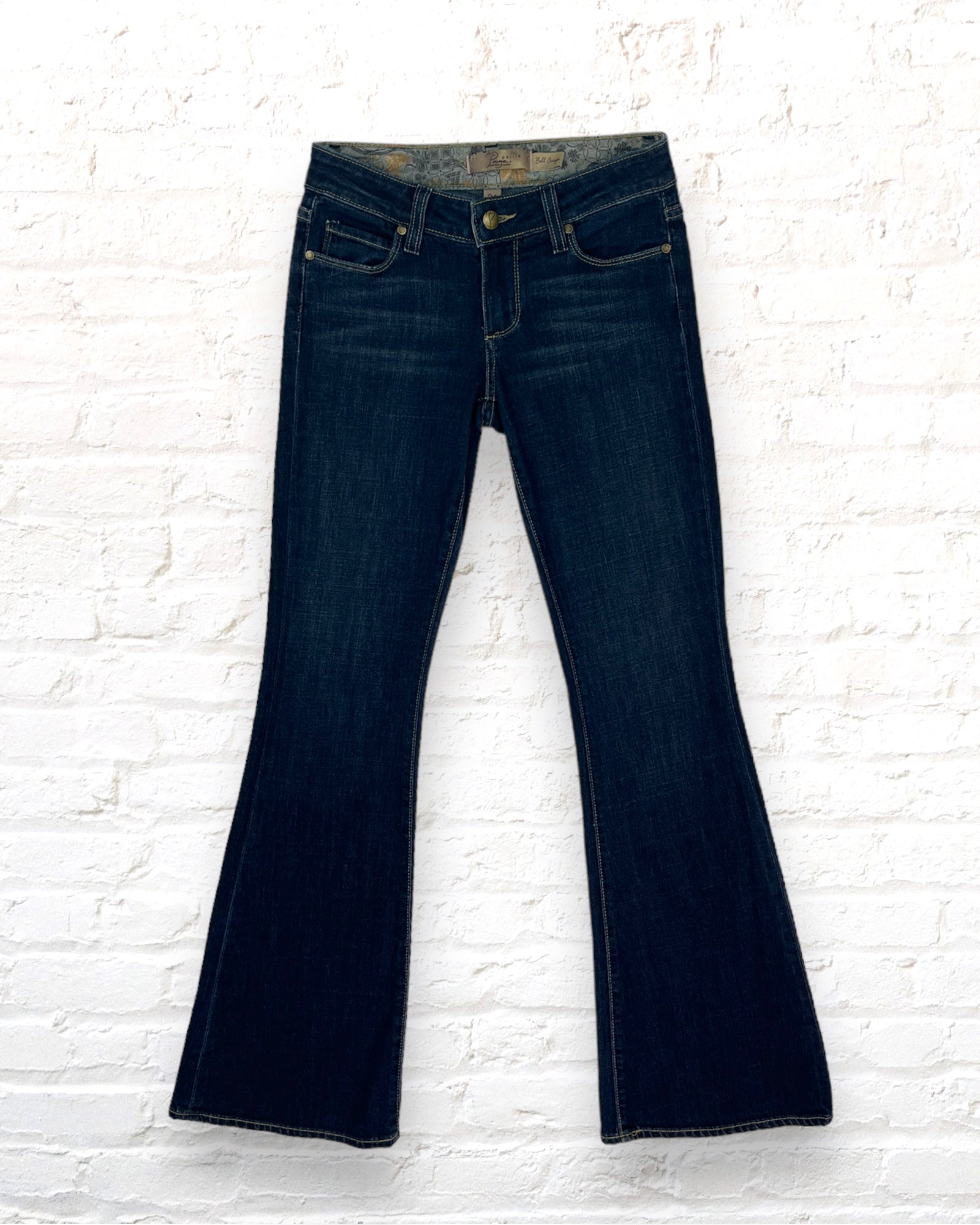 Vintage Paige flared jeans in a dark wash. Light whiskering on front pockets.