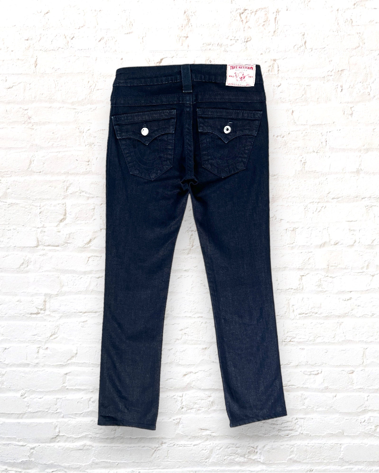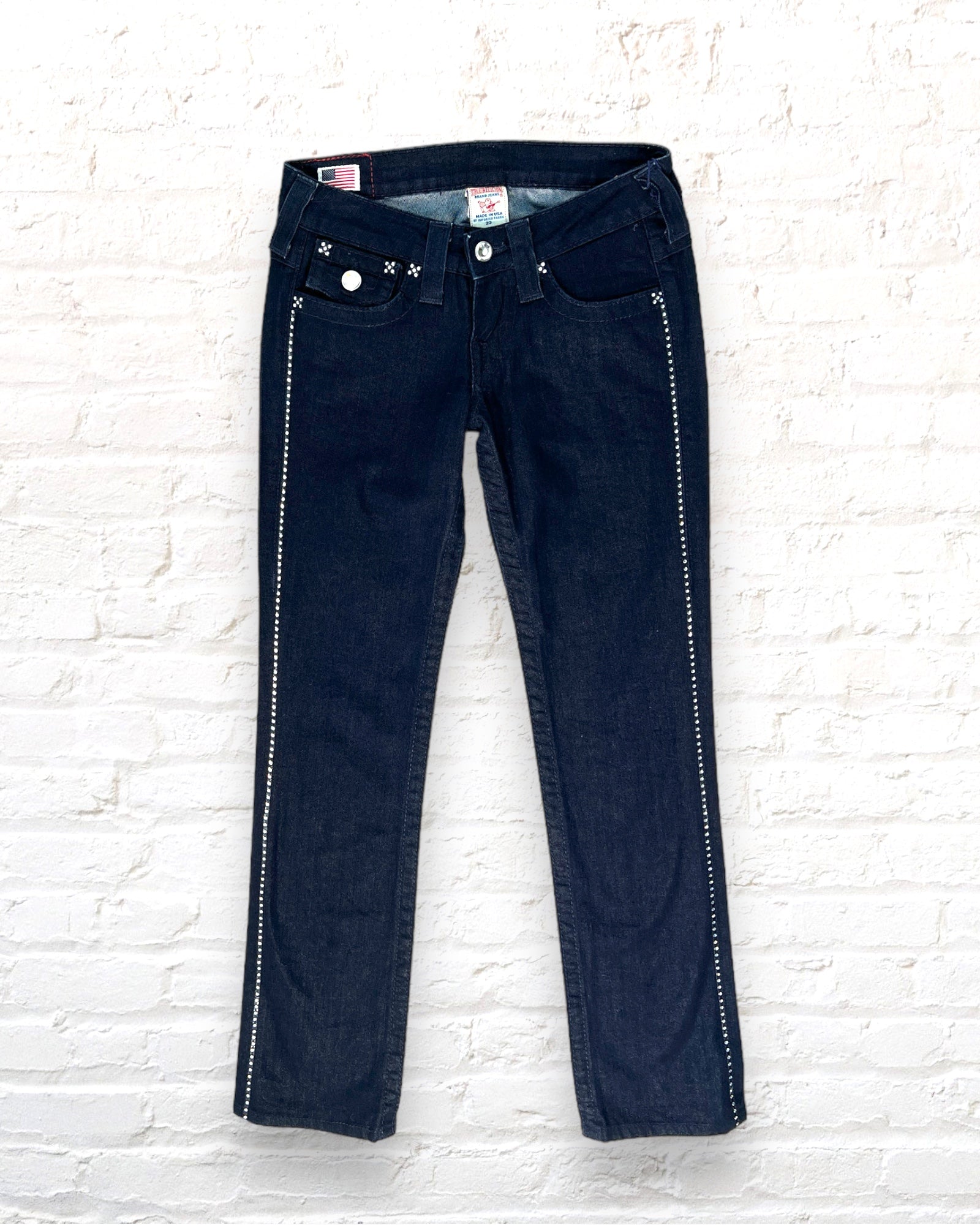 True Religion jeans with rhinestone embelishments on pockets and on outside of both legs (tuxedo stripe).